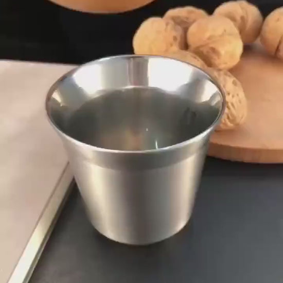 Espresso, wo Du willst: Doppelwandige Edelstahl-Tasse, robust und isoliert. Leicht, praktisch und immer bereit für Deinen Moment unterwegs.