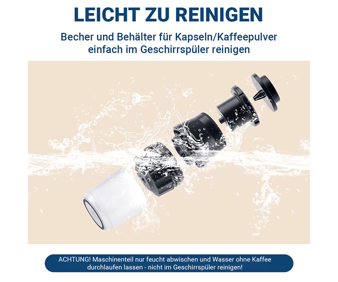 Oder einfach nur mit Wasser ausspülen, um gleich die nächste köstliche Tasse Kaffee zu genießen. Keine Pulver- oder Kaffeereste, keine unappetitlichen Flecken voriger Brühvorgänge - sondern immer die perfekte Tasse Kaffee, die Deinen Ansprüchen gerecht wird.