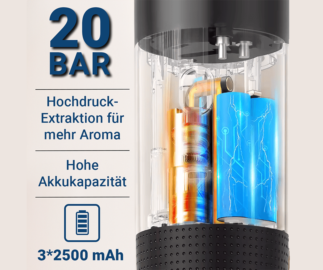 Mit einem leistungsstarken 20-Bar-Drucksystem für mehr Aroma, einfacher Ein-Knopf-Bedienung und flexibler USB-C-Ladung bringt Remera Una höchste Kaffeequalität dorthin, wo Du sie gerade brauchst. Dank der hohen Akkukapazität kannst Du 4-5 Tassen heißen Kaffee aus kaltem Wasser, oder über 50 Tassen mit vorgeheiztem Wasser zubereiten. Ob mit Nespresso®-Kapseln, Dolce Gusto®-Kapseln oder klassischem Kaffeepulver – Du wählst, worauf Du Lust hast.